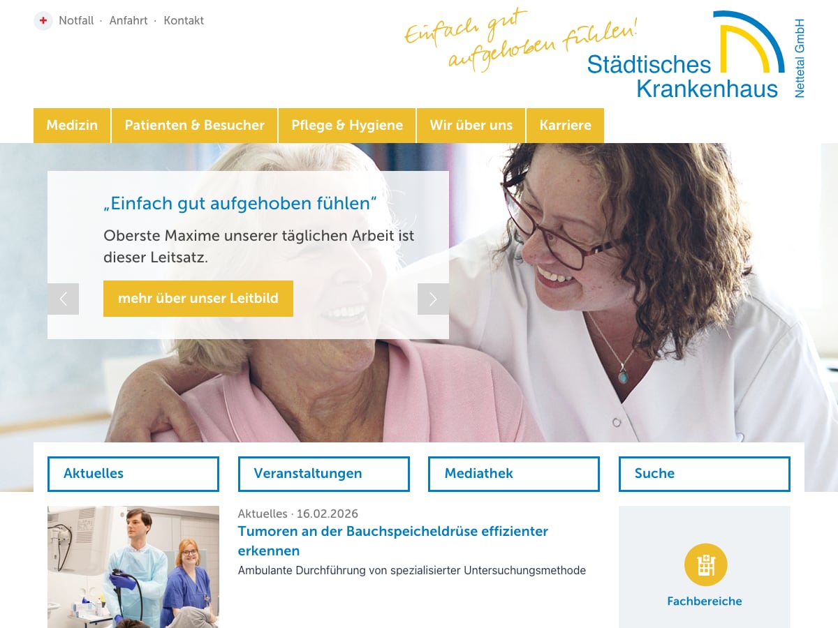 Das Städtische Krankenhaus Nettetal versorgt Patienten mit einem breiten medizinischen Spektrum — von Innerer Medizin und Chirurgie über Kardiologie und Onkologie bis zu spezialisierten Zentren.