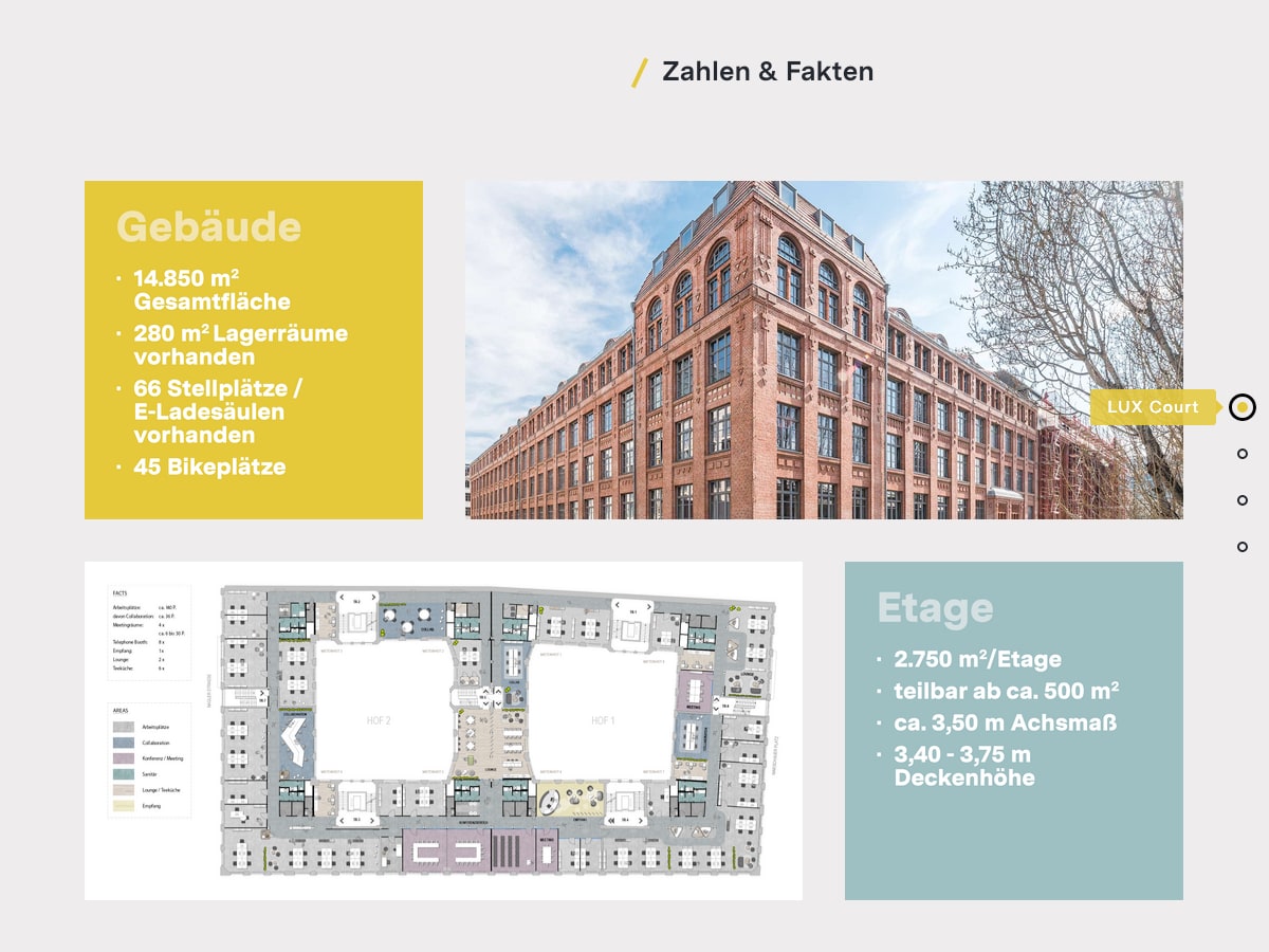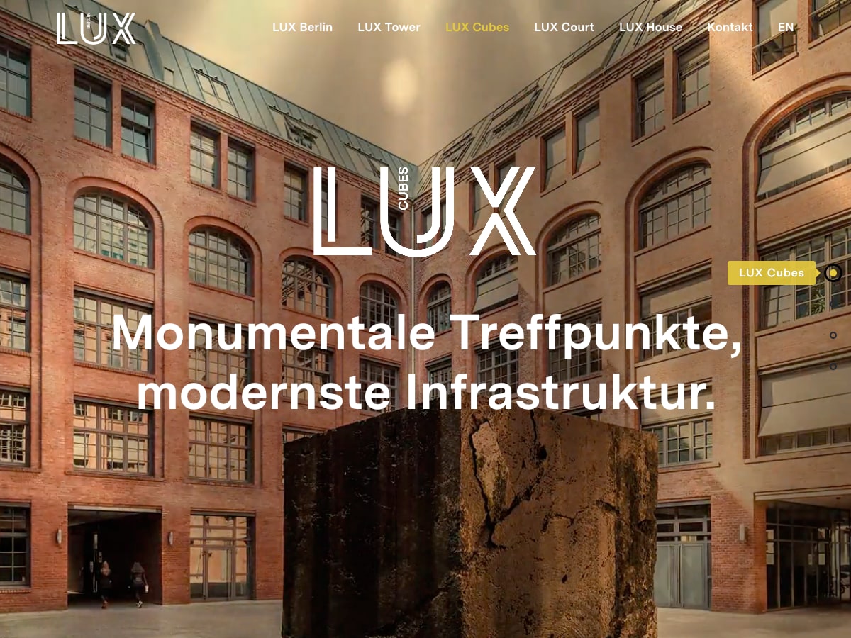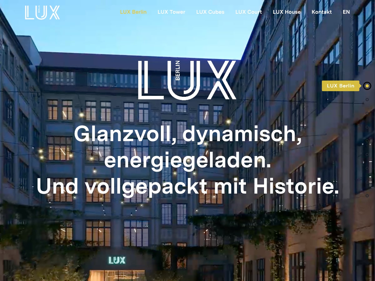 LUX Berlin ist ein eigenständiges Vermarktungskonzept für ein Büroquartier mit vier Gebäuden auf dem historischen OSRAM- und NARVA-Gelände an der Berliner Spree — mit eigener Domain und eigenem visuellen Auftritt.