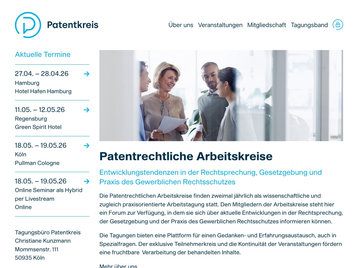 Patentkreis organisiert zweimal jährlich Arbeitstagungen für Patentanwälte und Fachleute des gewerblichen Rechtsschutzes — mit Veranstaltungsübersicht, Mitgliederbereich und Tagungsband.