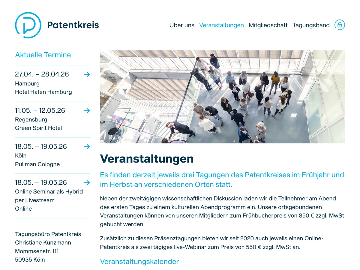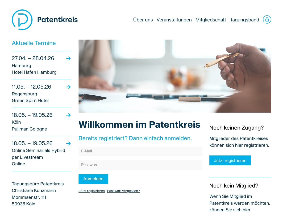 Webdesign für ein Netzwerk patentrechtlicher Fachtagungen mit Mitgliederbereich.