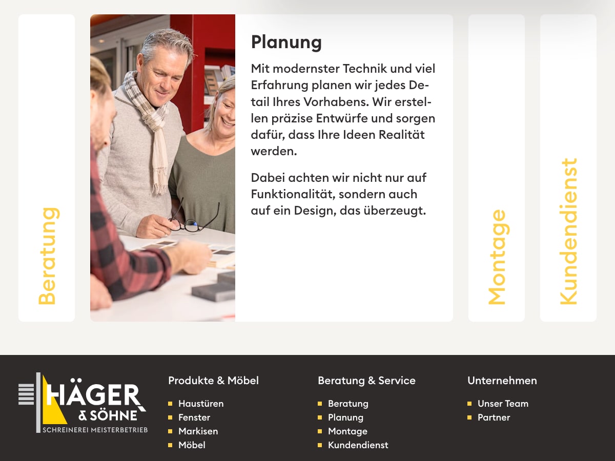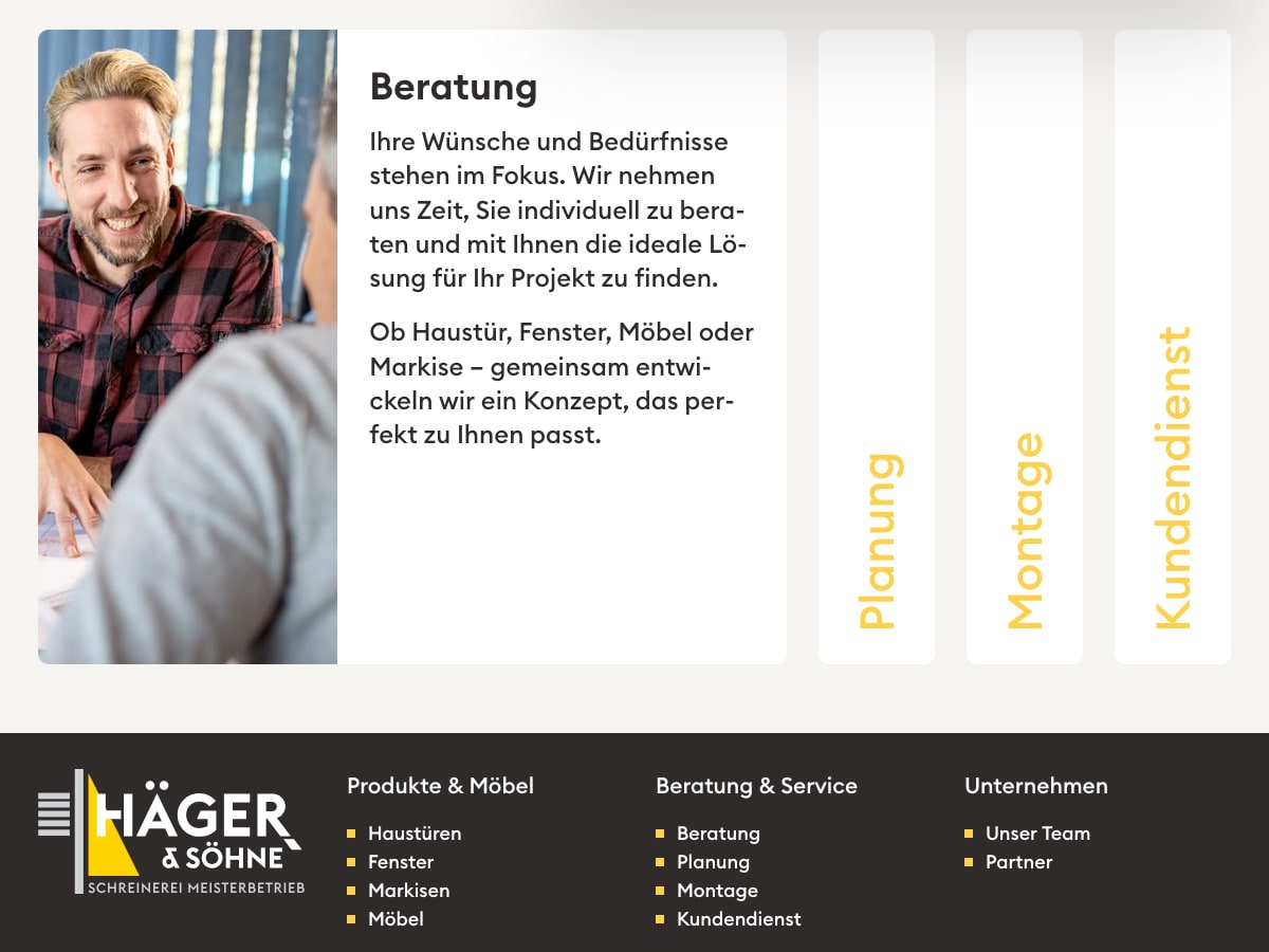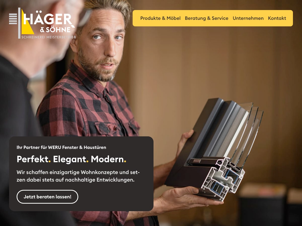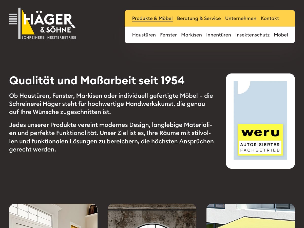 Häger & Söhne ist ein WERU-Fachpartner und Schreinerei-Meisterbetrieb in Kerpen — mit Leistungen von Haustüren und Fenstern über Sonnenschutz bis zum Innenausbau.