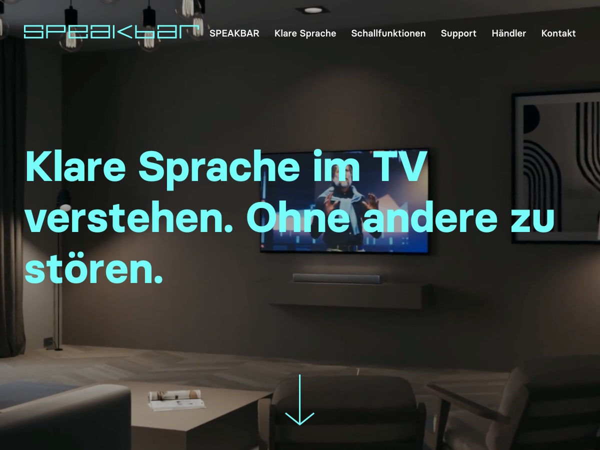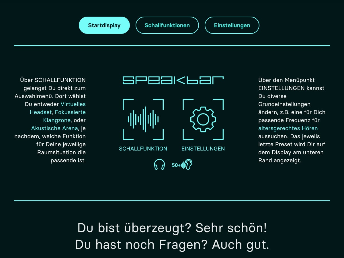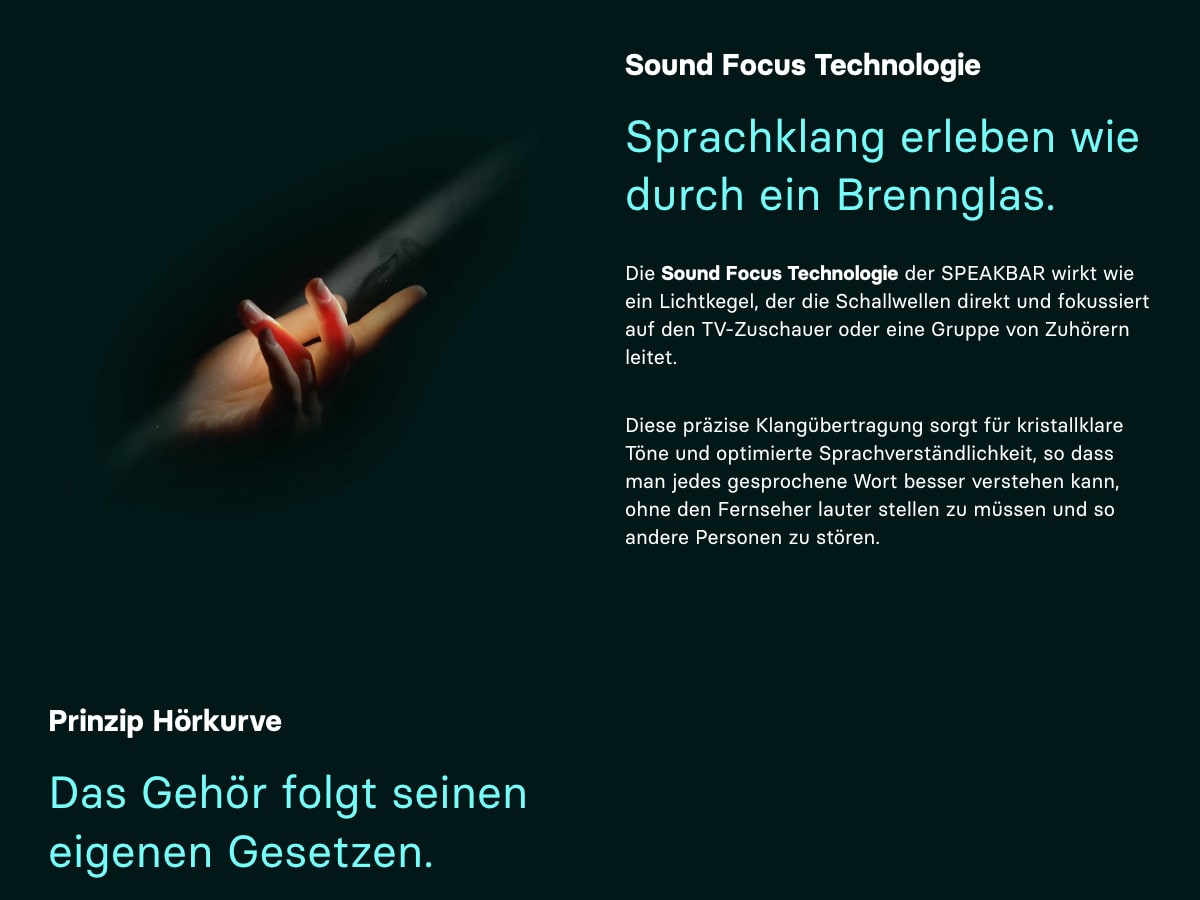 Speakbar ist eine Soundbar für besseres Sprachverstehen beim Fernsehen — mit Schallfunktionen wie Virtuellem Headset, Fokussierter Klangzone und Altersgerechtem Hören.