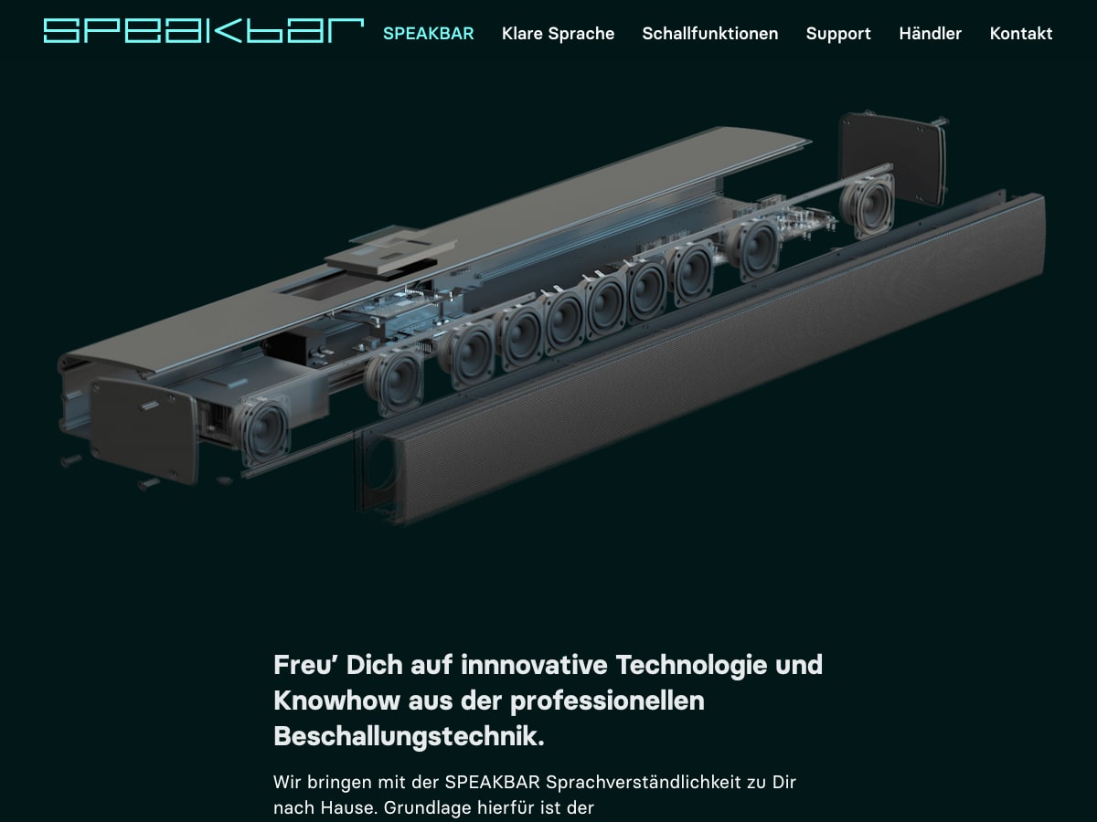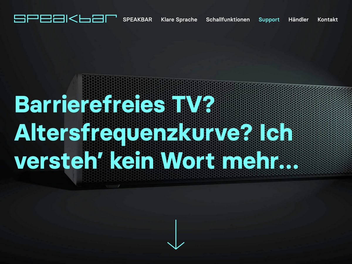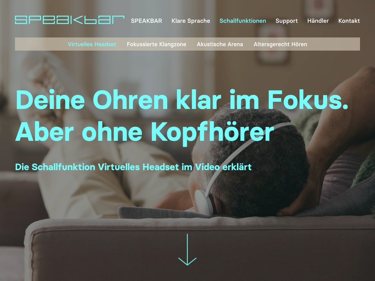 Speakbar ist eine Soundbar für besseres Sprachverstehen beim Fernsehen — mit Schallfunktionen wie Virtuellem Headset, Fokussierter Klangzone und Altersgerechtem Hören.